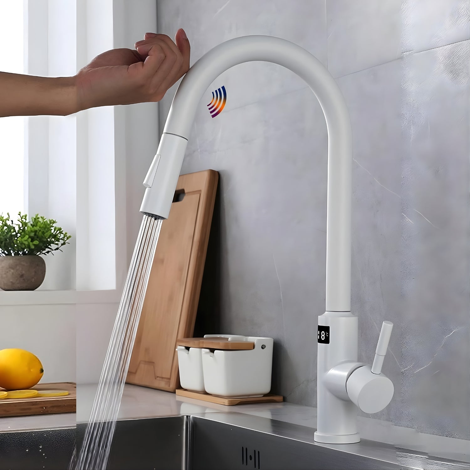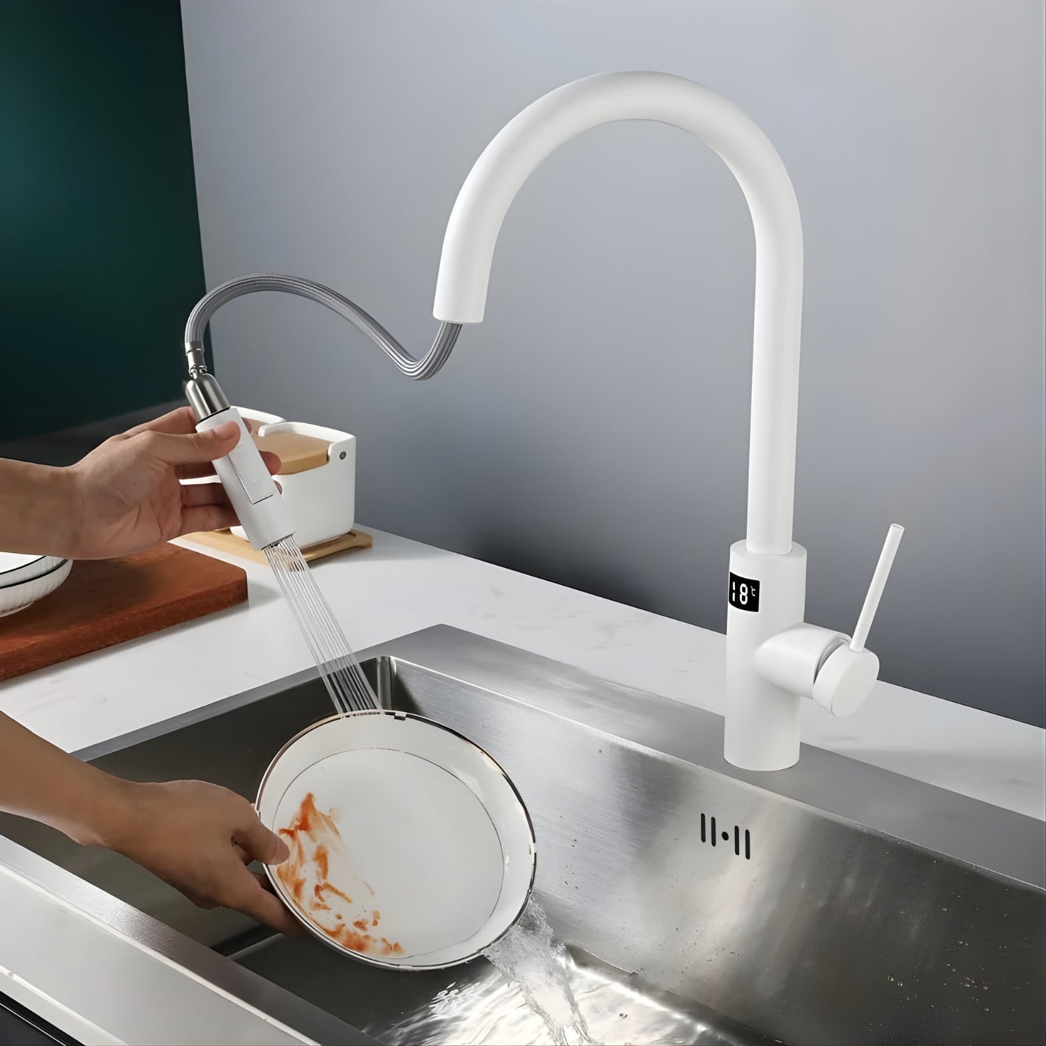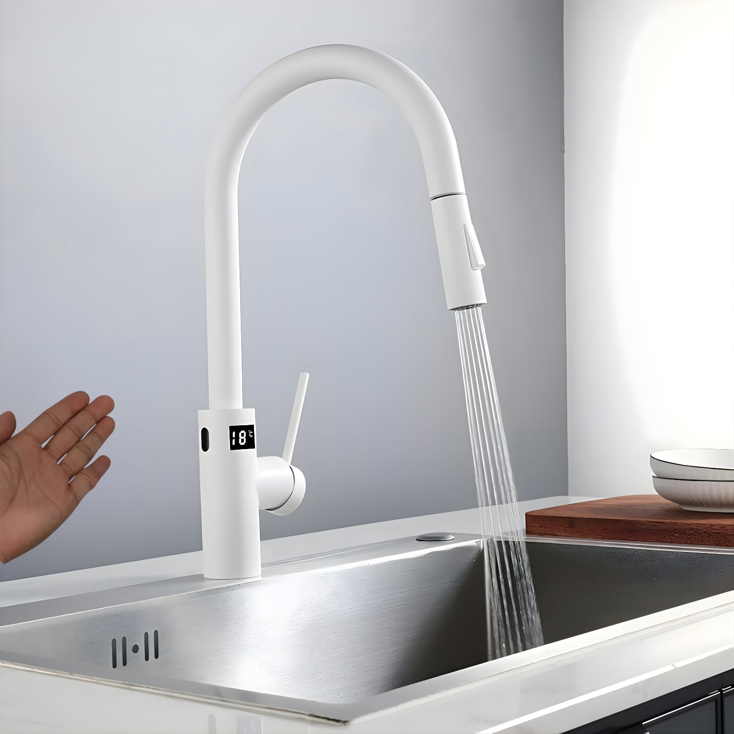 Experience a kitchen revolution with the Falkenberg Pro Touchless Pull-Out Kitchen Faucet. Crafted from high-quality, durable materials, this faucet seamlessly blends form and function, offering the perfect balance of elegance and utility. Its visible temperature display adds a touch of ritual to your daily routine, while the rotatable pull-out spout provides unmatched flexibility, making all-around, multi-angle cleaning a breeze.