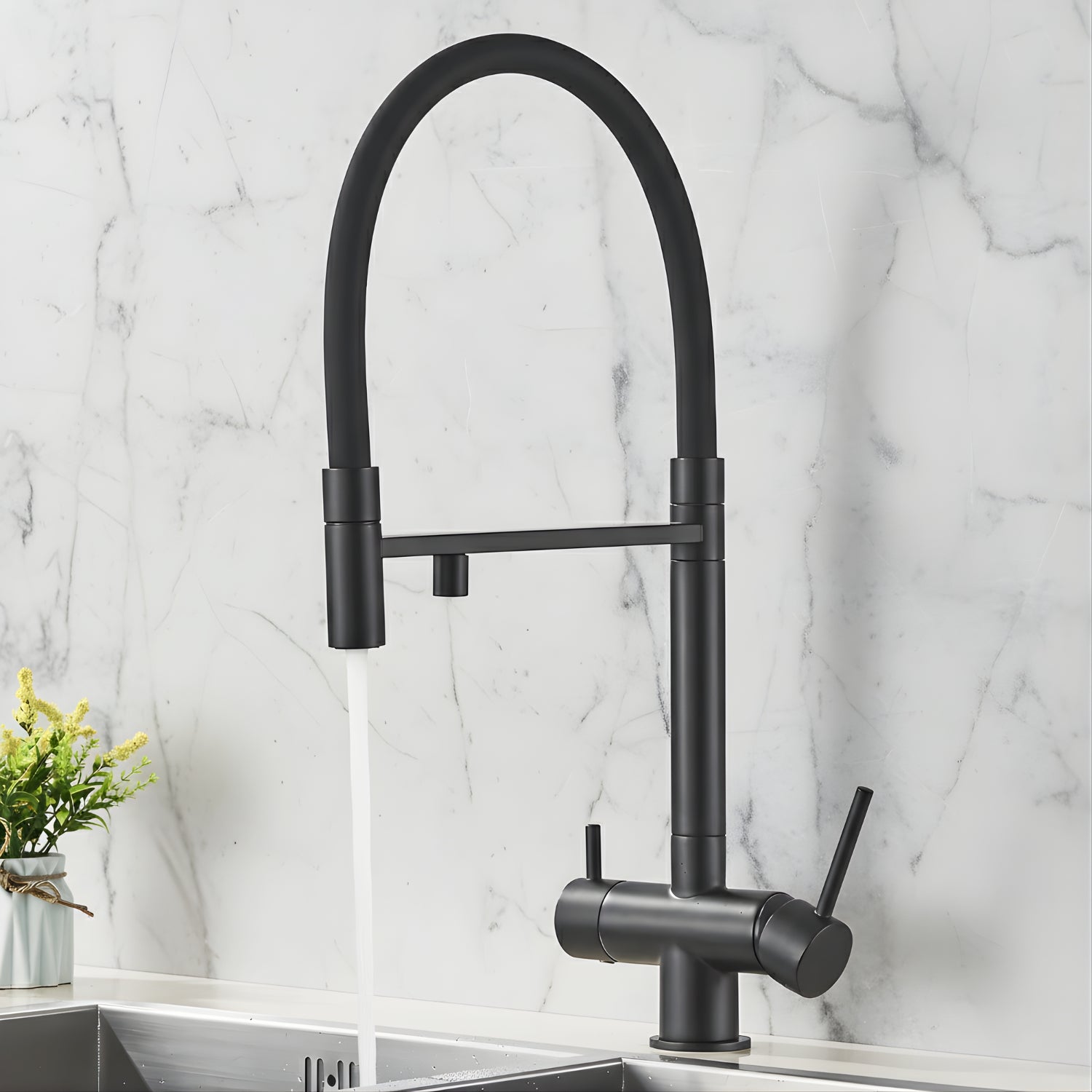 Introducing the Trier Modern Pulldown Kitchen Faucet, your solution for cleaning dishes with maximum efficiency. The gooseneck design provides ample space for filling tall stock pots, while the 360-degree swivel spout with a flexible hose ensures access to your entire kitchen sink. Plus, enjoy the convenience of a water filter filler for healthy, filtered drinking water at your fingertips. RO filters compatible.